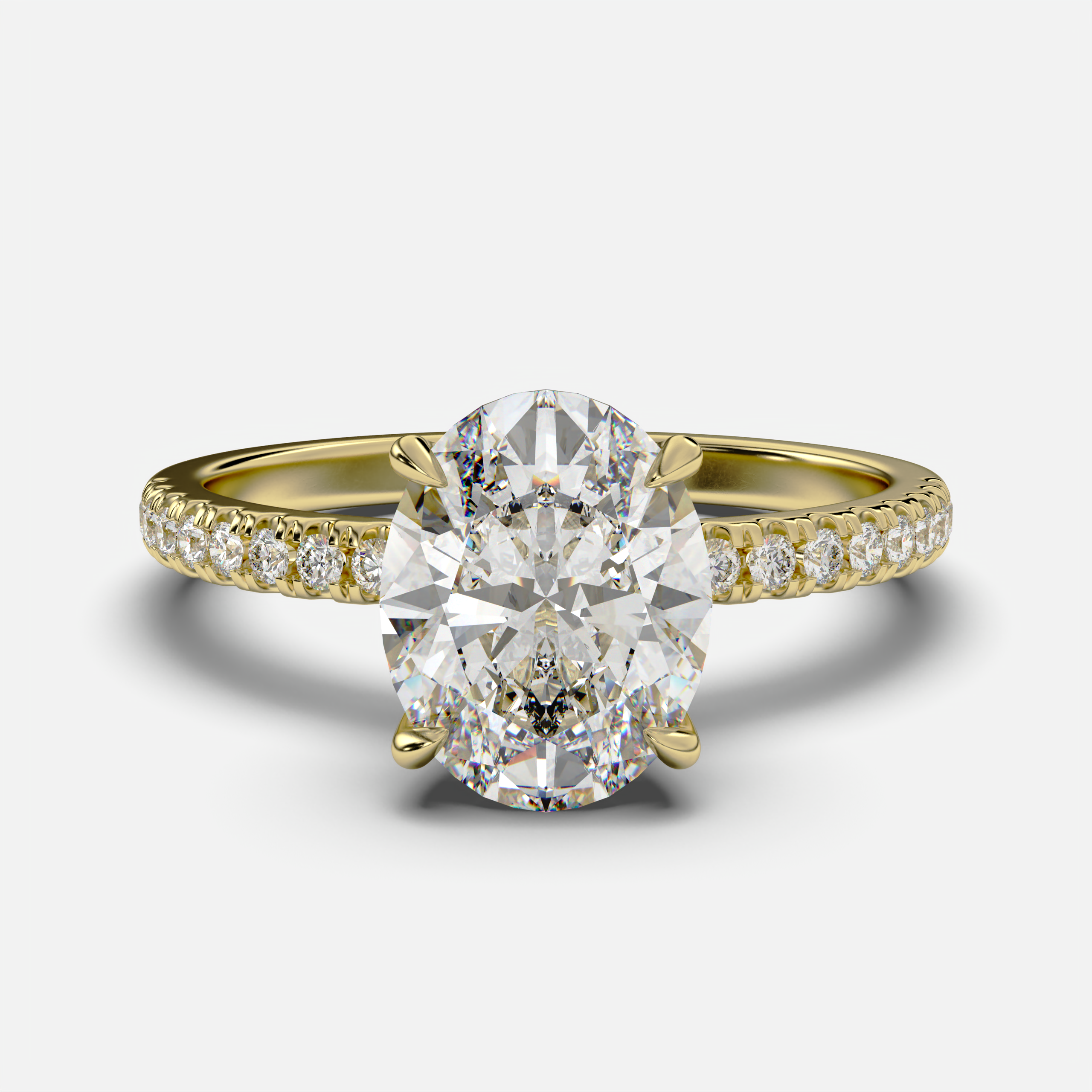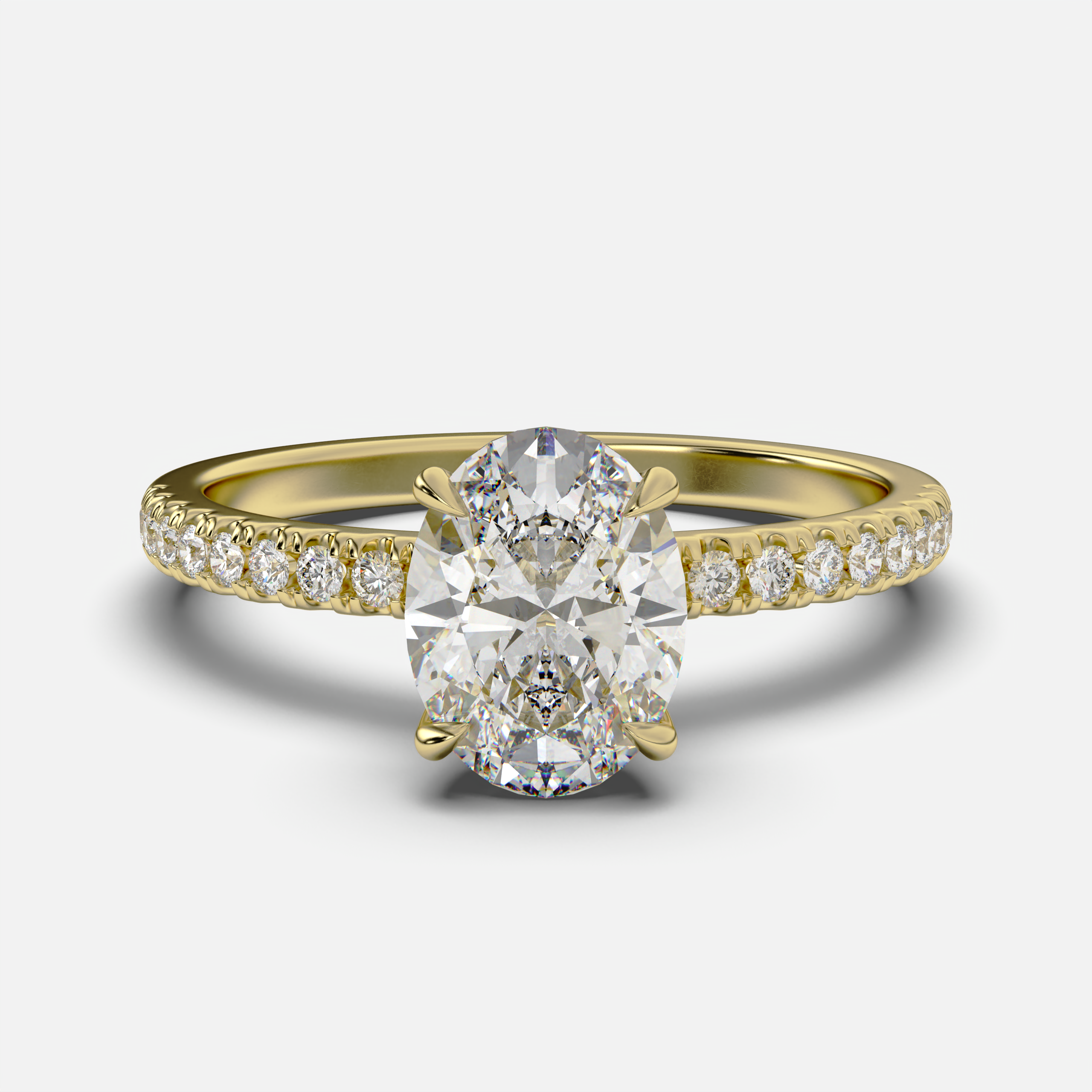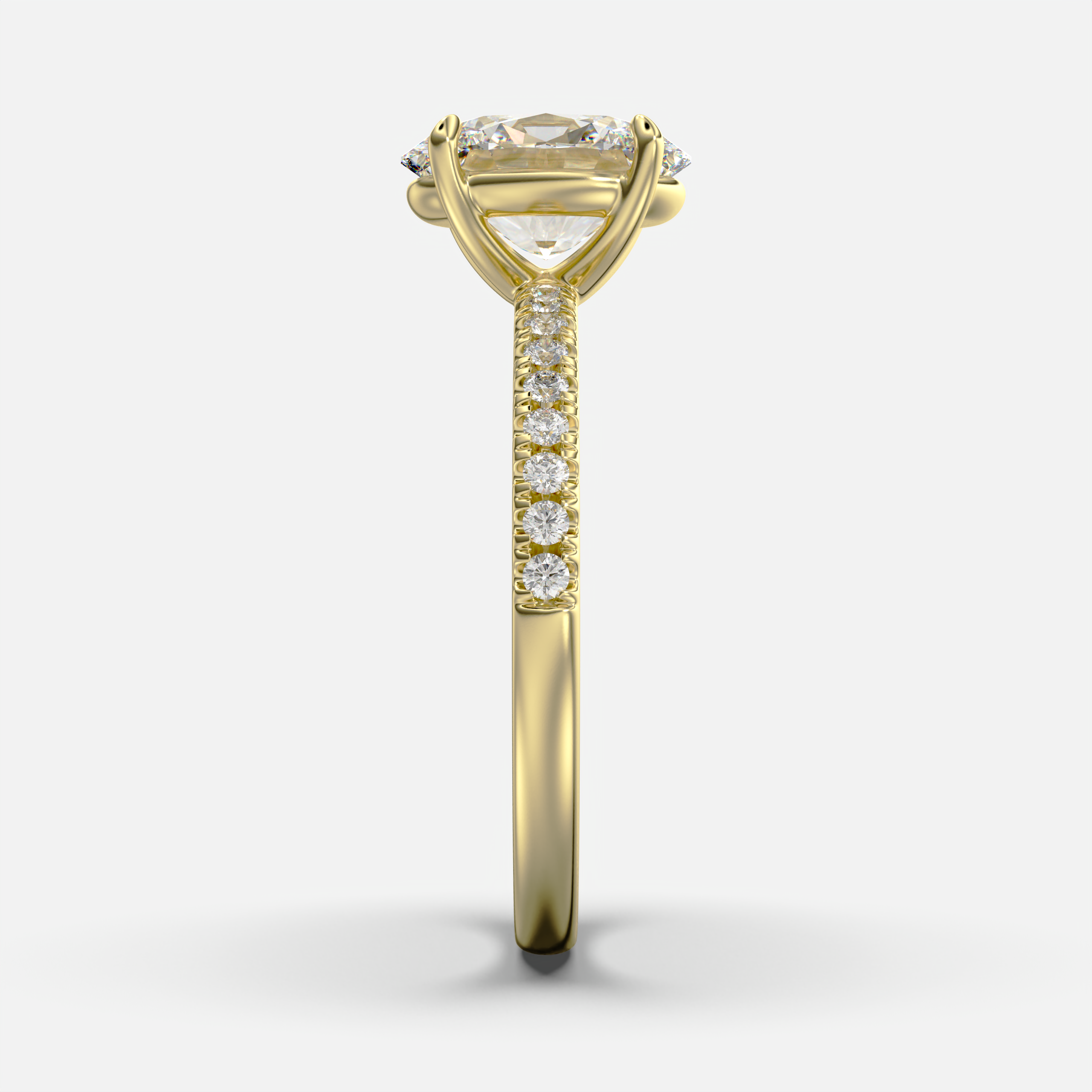 Anillo de compromiso en oro amarillo presenta un diamante central de corte ovalado, realzado por un pavé de 0.20ctw de diamantes que se extiende a lo largo del aro. El diseño combina la elegancia del corte ovalado con la luminosidad del pavé y el toque cálido del oro amarillo.
