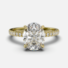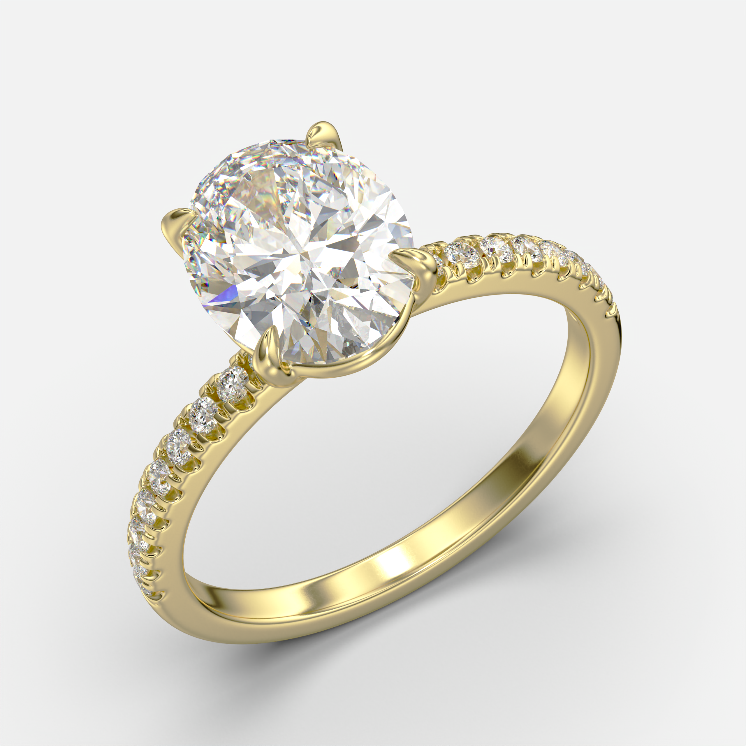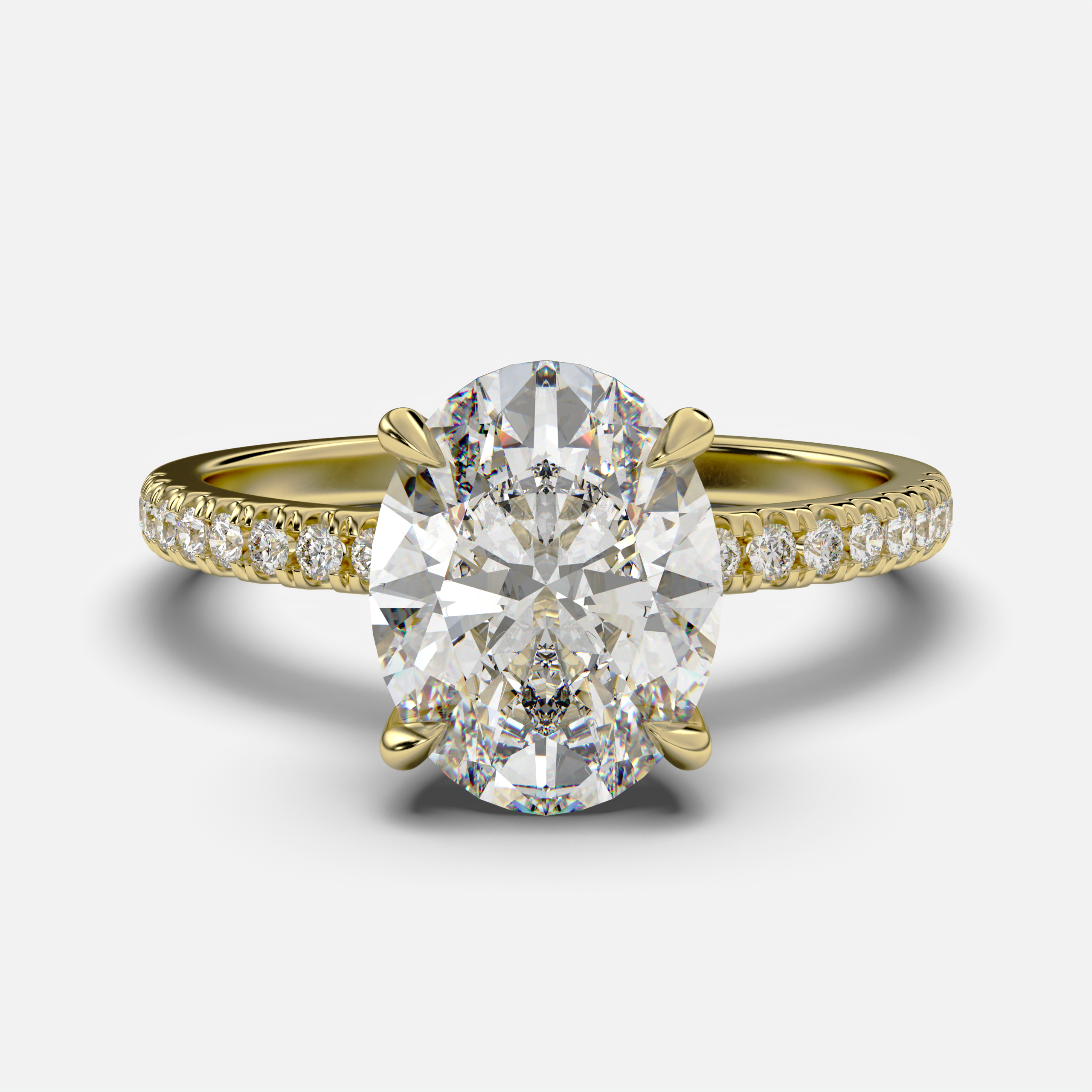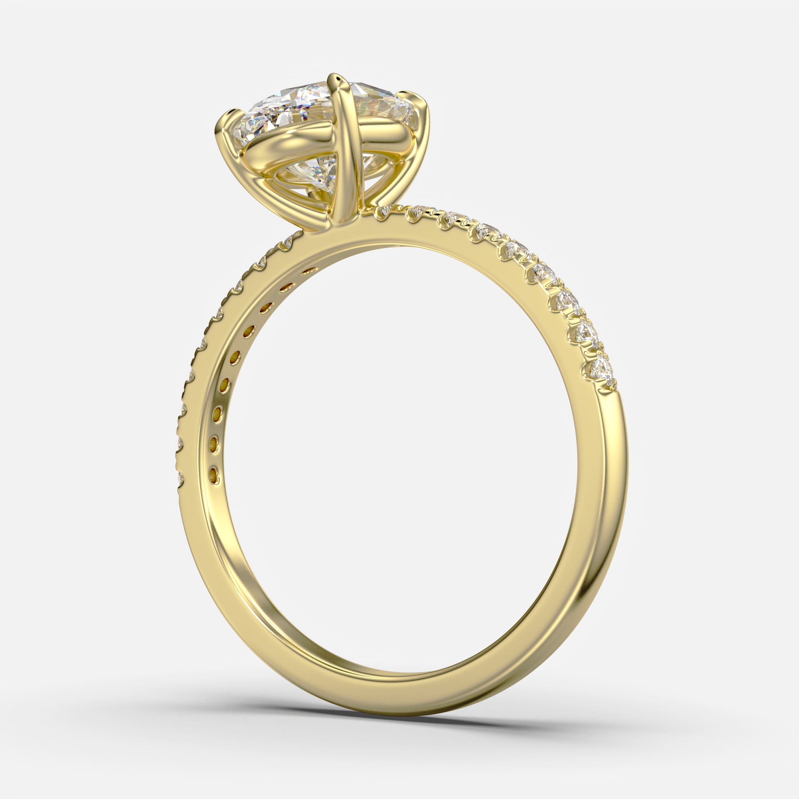 Anillo de compromiso en oro amarillo presenta un diamante central de corte ovalado, realzado por un pavé de 0.20ctw de diamantes que se extiende a lo largo del aro. El diseño combina la elegancia del corte ovalado con la luminosidad del pavé y el toque cálido del oro amarillo.