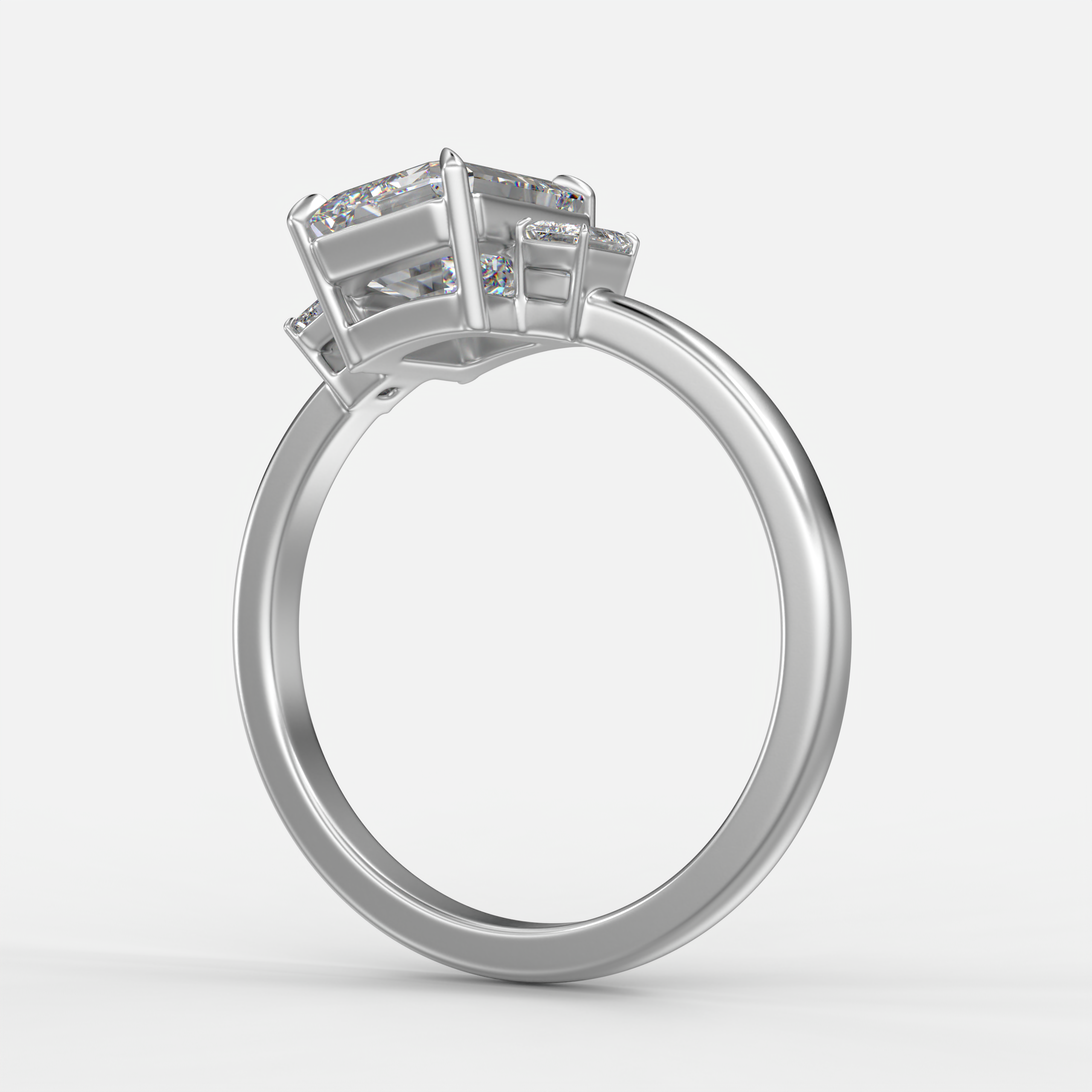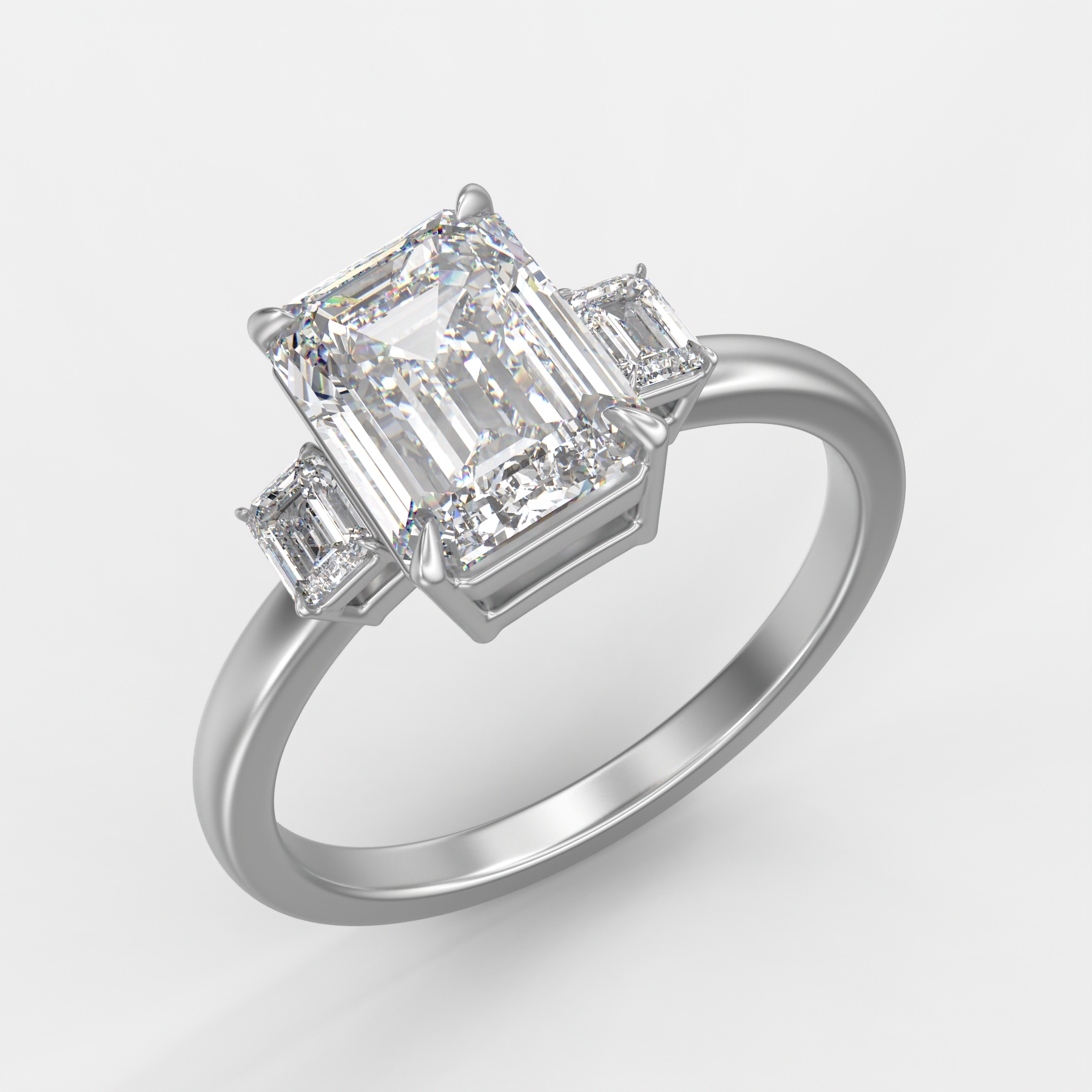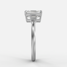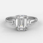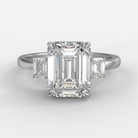 Anillo de compromiso de tres piedras en oro blanco. Diamante central corte esmeralda, acompañado por dos diamantes laterales corte esmeralda de 0.30ctw. Diseño equilibrado que enfatiza la elegancia clásica y la sofisticación discreta.